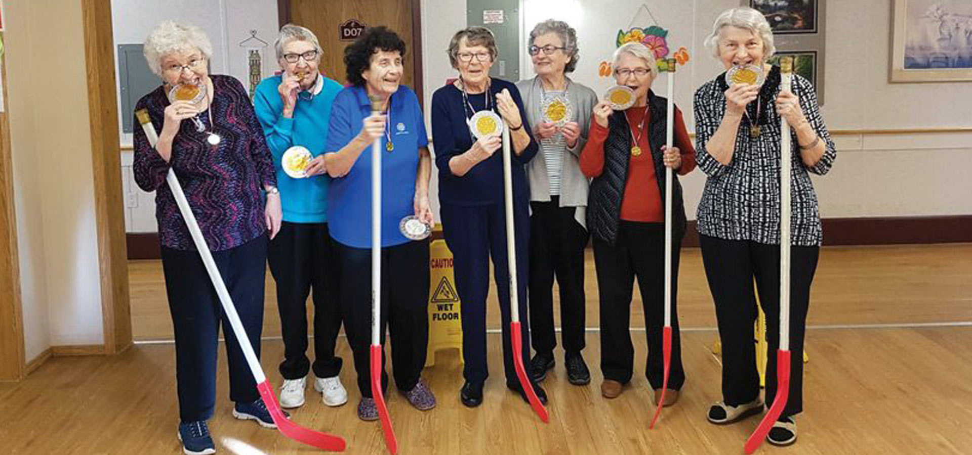 Grove Manor Women’s floor hockey team celebrating their gold win at the 2018 Winter Olympics.